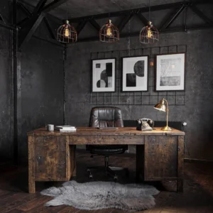 This office is where blueprints meet bourbon. Matte-black concrete walls would feel like a parking garage if not for the reclaimed ironwood desk’s warm grain. Black leather on the executive chair? That’s not just practical—it’s a dare to spill coffee. Edison bulbs in cage pendants cast shadows dramatic enough for your next existential crisis, while the sheepskin rug is the only thing stopping this from becoming a Dexter kill room. Takeaway: Mix at least two organic materials (wood, leather) with industrial metals unless you want your office to double as an interrogation space.